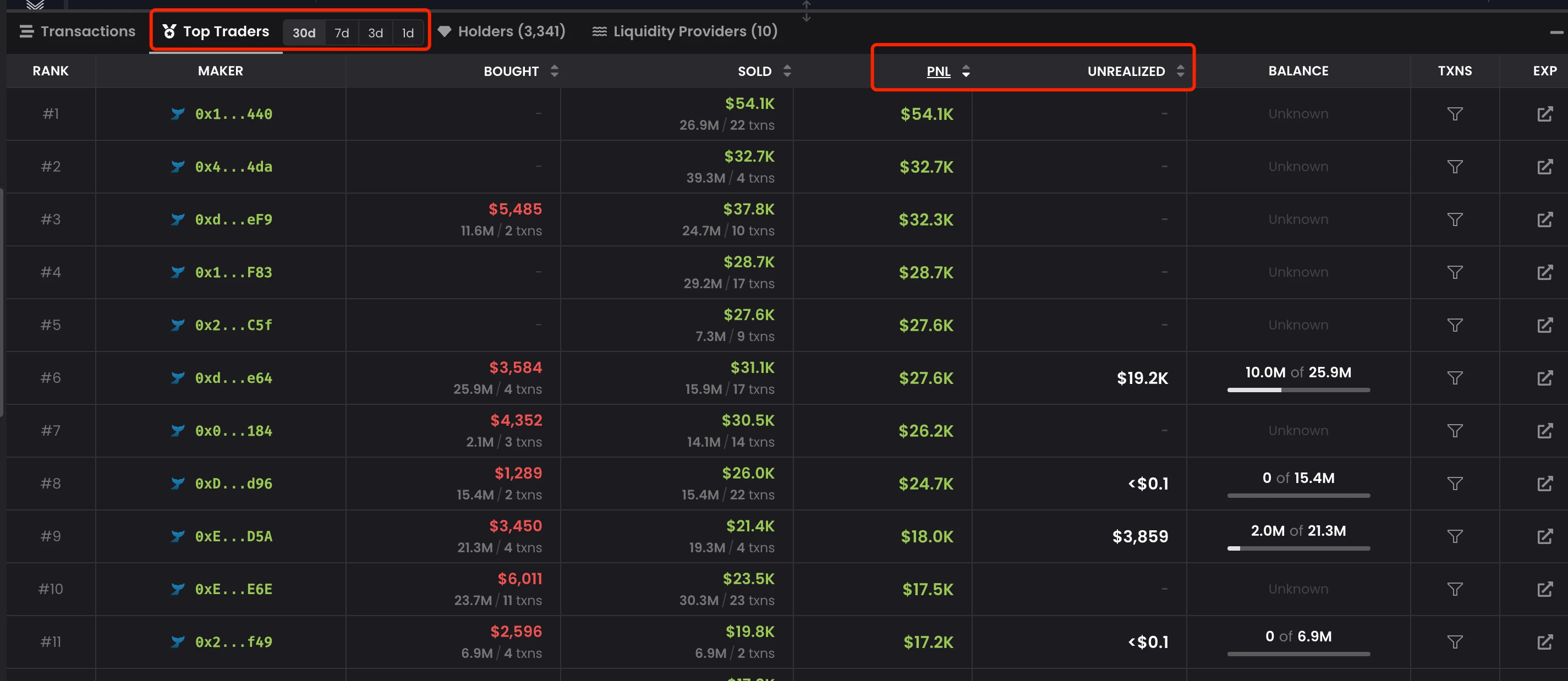 老鹰的【Top Traders】版块列出了最赚钱的前 100 个地址,可以按总利润和未实现利润进行排序,显示信息有限,不如 debot 和 gmgn 功能好用。