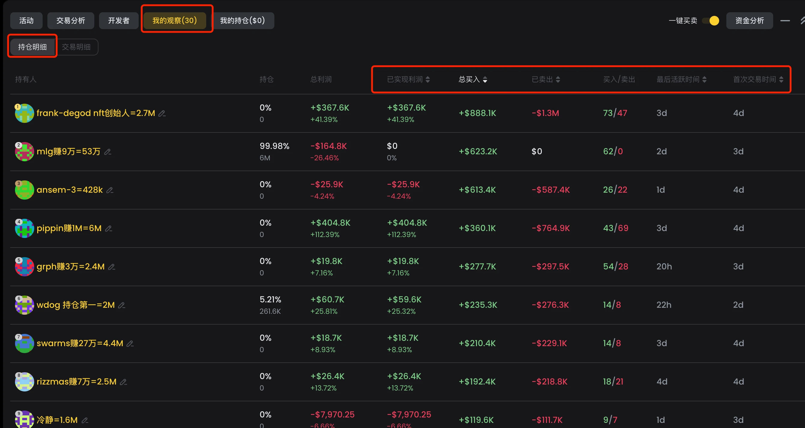 【持仓明细】列出了交易过这个币的所有聪明钱的数据,可以按各种指标进行排序筛选,方便我们查看有哪些聪明钱已经上车。