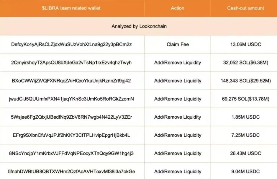 据 Lookonchain 监测,在中午 12 点之前,与 LIBRA 团队相关的 8 个钱包在推文发布前数小时从交易所提取 USDC 和 SOL,接着在代币上线瞬间狙击筹码,随后分批抛售,并通过增加流动性、移除流动性和索取费用获得了 5760 万枚 USDC 和 249, 671 枚 SOL(约合 4970 万美元),共计套现约 1.07 亿美元。
