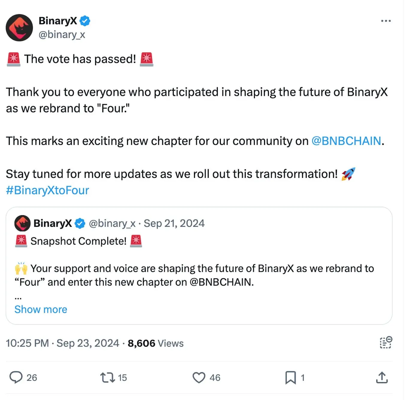 在2024年9月BNX发起了一项提案,即进行品牌变更为Four,以迎接其在7月2日推出和孵化的meme平台-Four.meme。该提案于2024年9月23日正式通过,但一直未更名,这次BNX的强势拉涨和Four的火热或许会不久迎来更名落实。