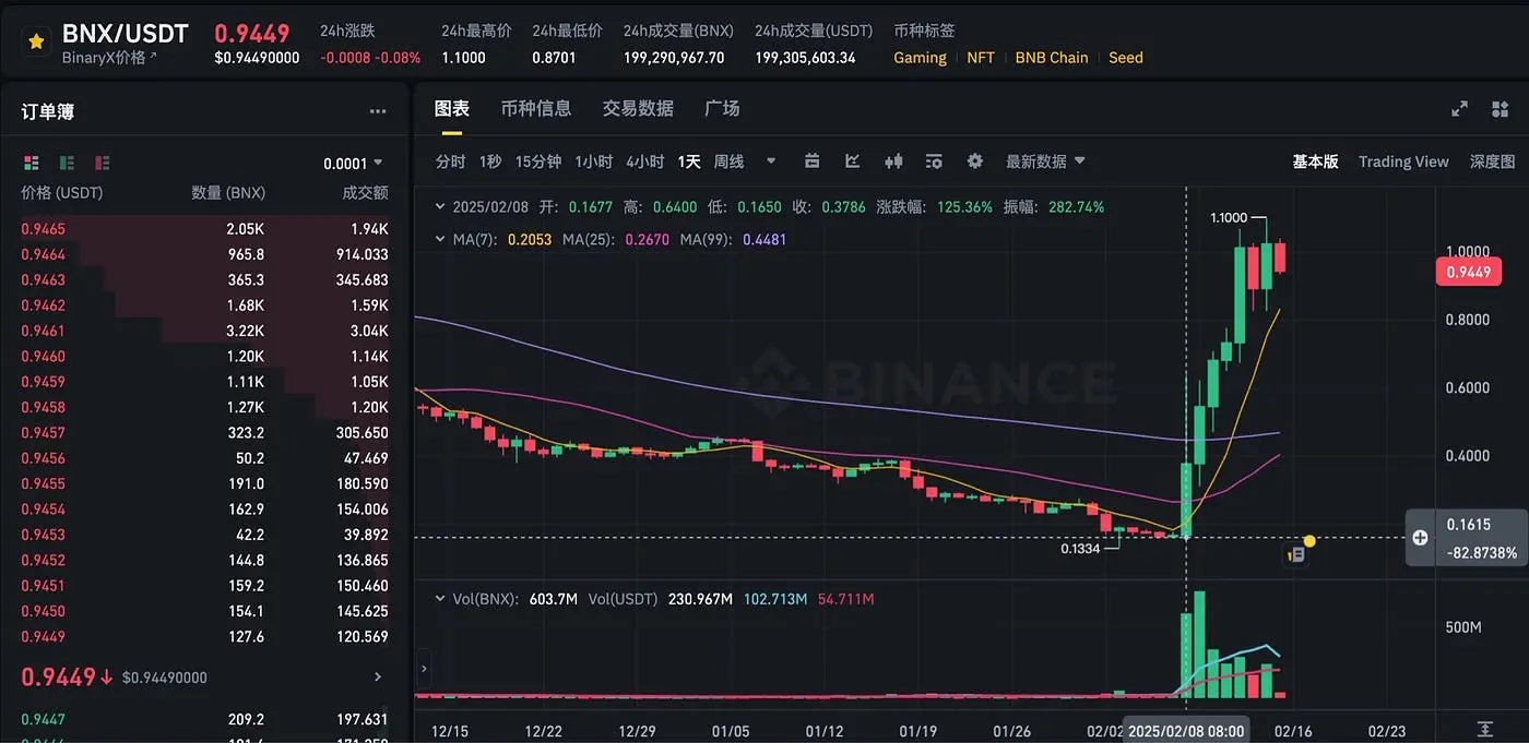 该事件促进了让大家进一步在Four.meme上去寻找BNB Chain的下一个“TST”,近日2月13日在Four上发行的Broccoli 也在三天来到了1.2亿市值。币安Cex中,BNX代币也引领了BN系代币的普涨,自2月8日以来,从单价0.16一周内拉至最高1.1美金,创造了一周7倍涨幅,随后以BNB,CAKE,BAKE,LISTA为首的代币也迎来了一波拉涨,但整体来看BNX的走势最为持续和坚挺。