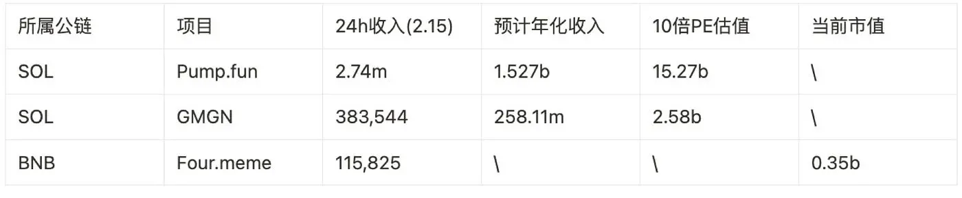 与Sol链项目横向对比来看,过去24小时中,Pump.fun收入为2.74m美元,GMGN为383.544美元,Four.meme为115.825美元,若BNB热度可以延续甚至进一步扩大,Four的收入应为GMGN的1/3–1之间。Defillama通过过去30天协议的收入数据估算了Pump.fun与GMGN的预计年收入,分别为1.572b美元与258.11m美元。传统金融公司的PE可以在10倍以上,Pump.fun等项目是Crypto市场中少有可以产生持续现金流的项目,PE保守可以在10倍以上。