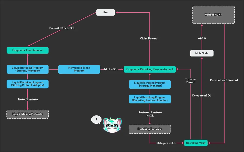 资产被委托给合作的验证者,这些验证者确保 NCN/AVS 网络的安全性。来自这些委托的收益将分配给 $fragmetric 资产持有者。Fragmetric 既充当投资组合管理者,又作为用户和再质押协议之间的流动性层。
