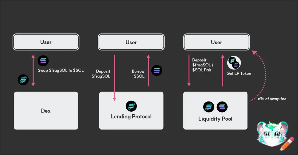 将 fragSOL 提供为去中心化交易所(DEX)池中的流动性。这不仅增加了整体流动性,还允许流动性提供者在赚取质押奖励的基础上,获得交易手续费。