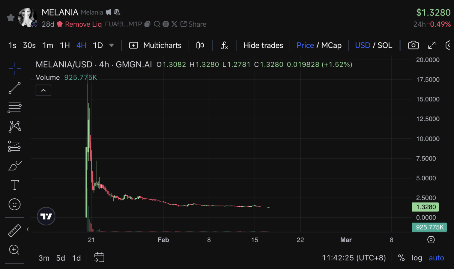 2025 年 1 月,梅拉尼娅·特朗普背书的 Melania 代币上线首日市值突破百亿美元,但随后因内幕抛售迅速崩盘,市值缩水至不足 20 亿美元。其模式与 LIBRA 高度相似,均依赖名人效应吸引散户,随后通过流动性抽逃收割。