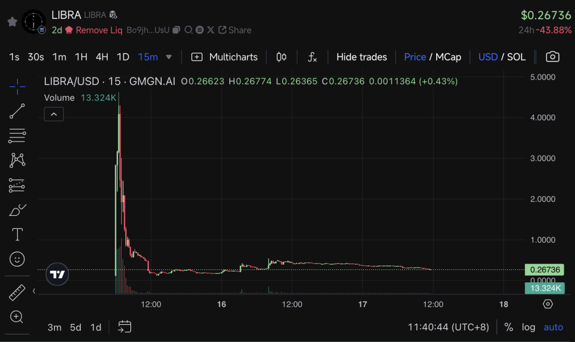 阿根廷总统米莱于 2025 年 1 月 30 日与项目技术顾问 Hayden Davis 会面,并在社交媒体宣传 Libra 代币,引发市场狂热。然而,代币上线后数小时内,项目方即从流动性池撤出 8700 万美元的 USDC 和 SOL,导致价格暴跌 80% 以上。米莱随后删除推文并启动反腐败调查,但已造成投资者巨额损失。