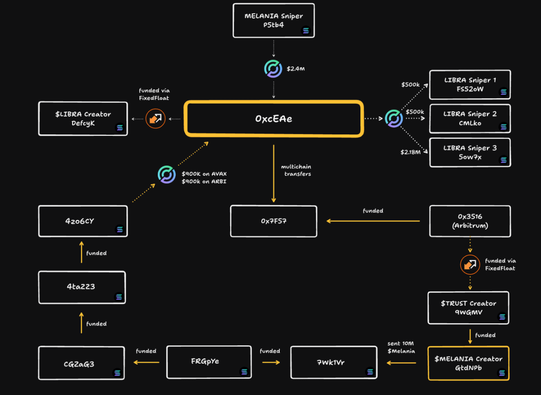 地址 0xcEA 再次出现,为 Libra 代币的创建者 DEfcyK 提供资金支持,并通过多个关联钱包对 Libra 进行「抢跑交易」,获利 600 万美元。同时,Libra 团队从流动性池撤资 8700 万美元,进一步加剧崩盘。