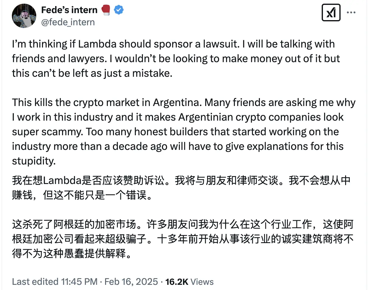 阿根廷 Lambda Class 创始人指出,此类事件严重损害该国加密行业声誉,许多诚信建设者受牵连。
