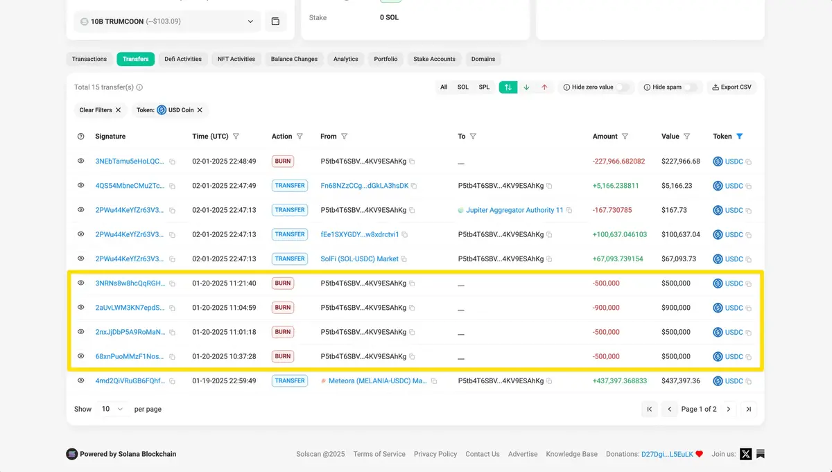 通过分析 Solana 和 Avalanche 等链上记录,Bubblemaps 发现 0xcEA 地址频繁使用跨链协议转移资金,掩盖真实流向。例如,Melania 代币的利润通过 CCTP 转换为 USDC 后,流入 Libra 的创建者钱包。