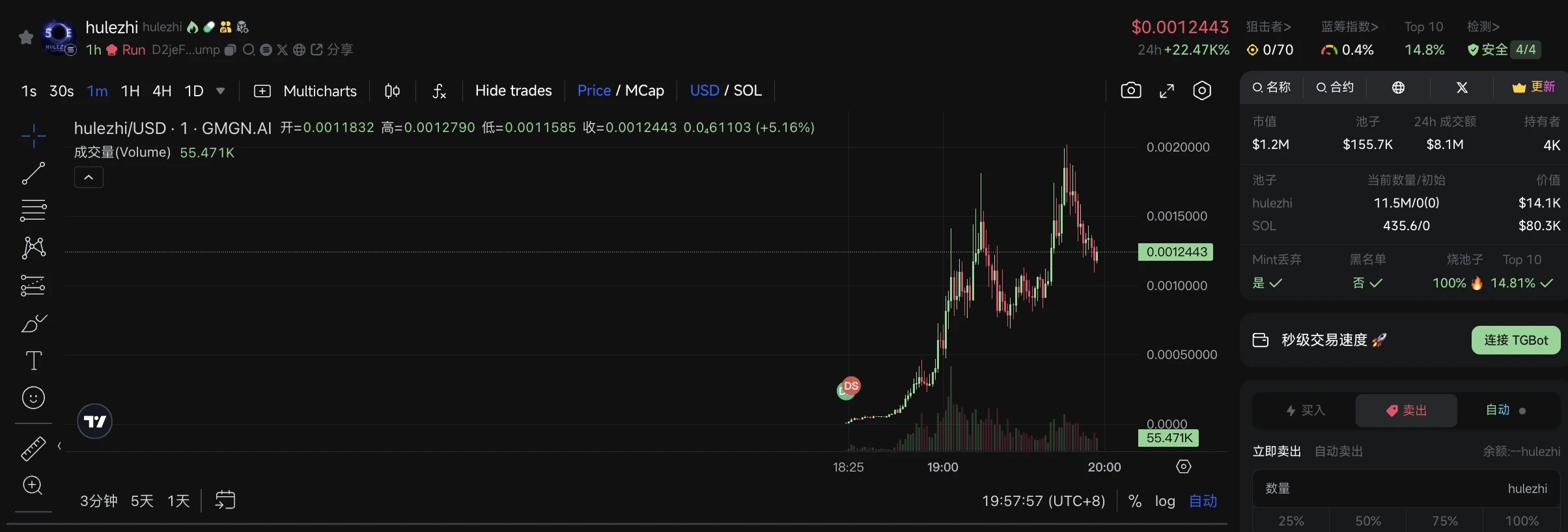 hulezhi,据 GMGN 数据,高点价格一度突破 0.002 美元,市值一度突破 200 万美元,目前市值已大幅回落,暂报 120 万美元。