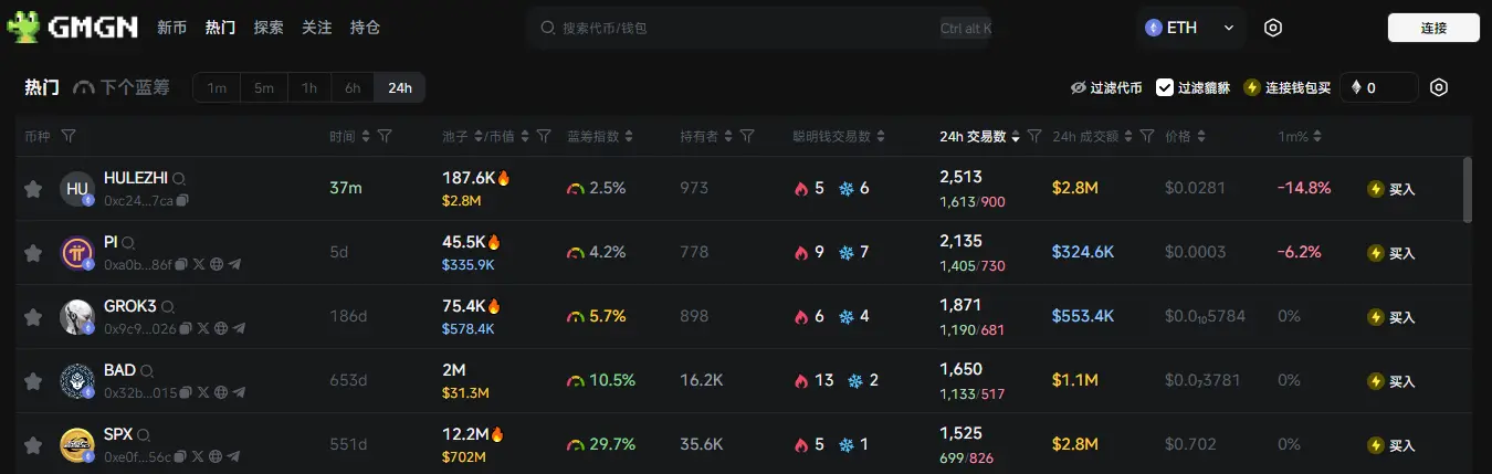 过去 24h 以太坊热门代币前五依次为:HULEZHI、PI 、GROK3、BAD、SPX