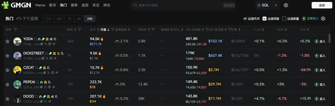 过去 24h Solana 热门代币前五依次为:YODA 、DICKSTREET 、CZCAT、PEPEAI 、DOOD