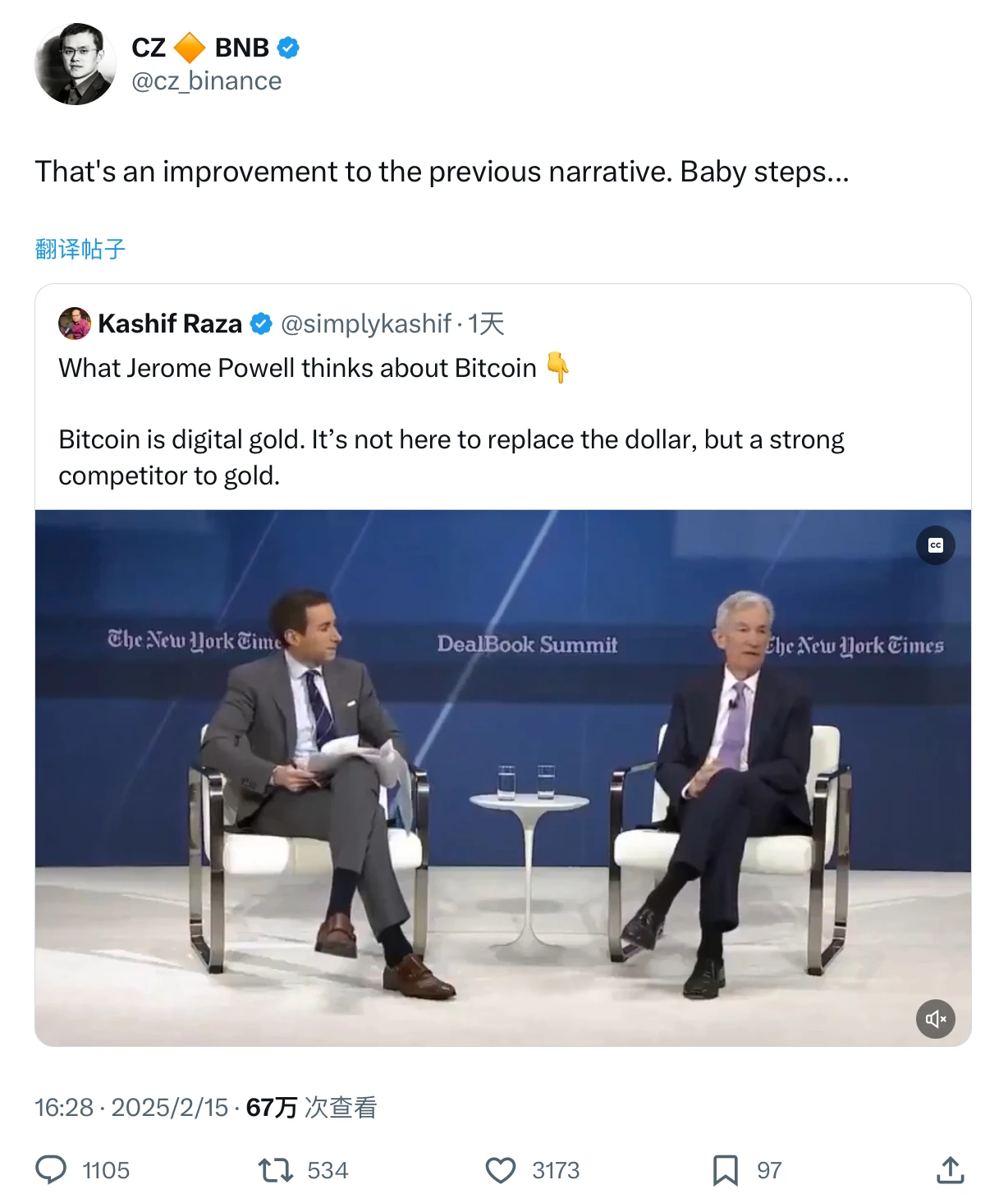 CZ:美联储主席鲍威尔对比特币看法正在改进,循序渐进