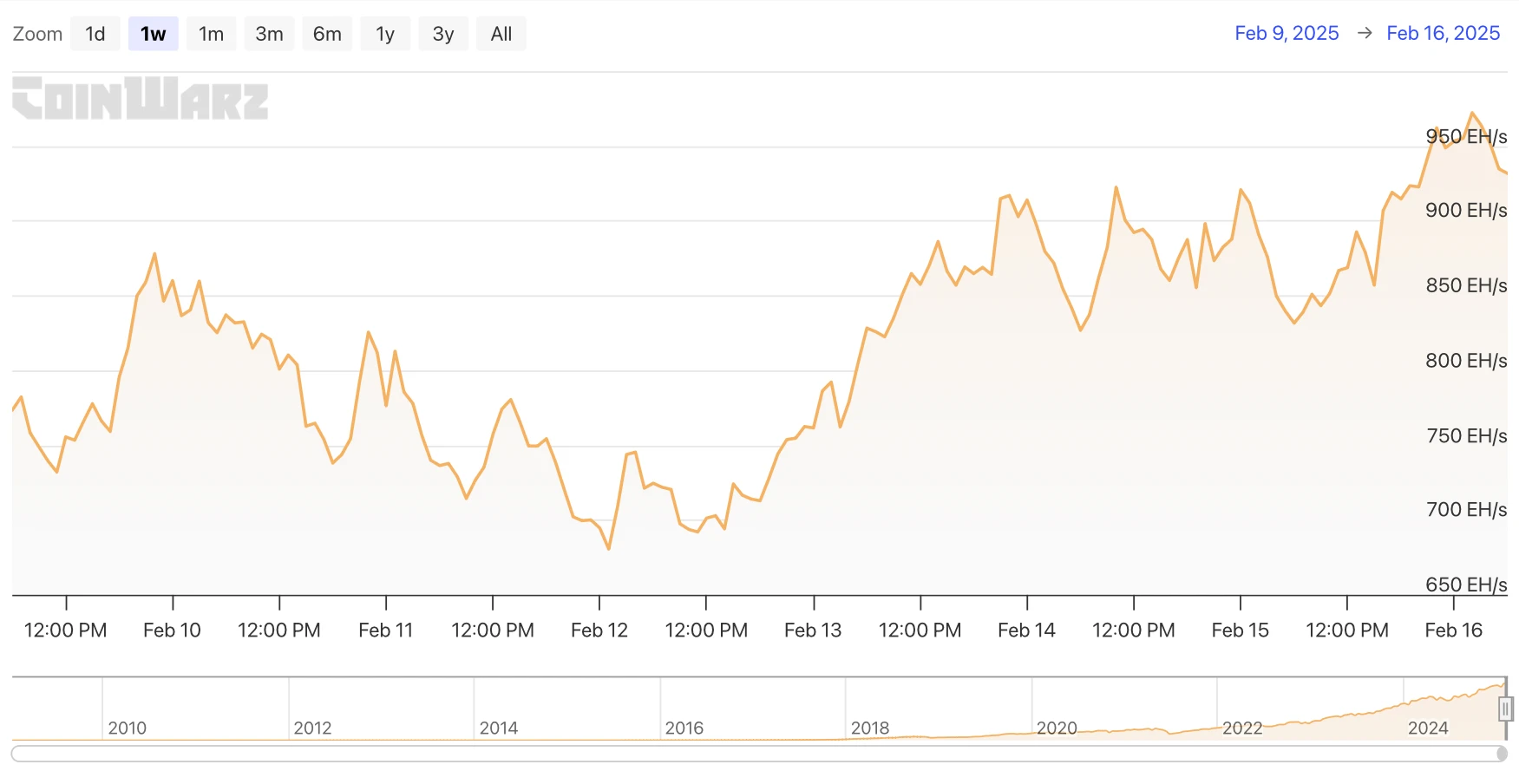 在 2025 年 2 月 10 日至 2 月 16 日期间,比特币网络哈希率经历显著波动,整体呈现“先回调、后修复”的趋势。2 月 10 日,哈希率自前一日的 877.93 EH/s 小幅震荡下行,最低触及 737.95 EH/s,随后迅速反弹至 825.44 EH/s。2 月 11 日,哈希率表现出“下降—反弹—再度回落”的走势,从 714.28 EH/s 短暂回升至 780.39 EH/s,但随后进一步下探至本周最低点 680.48 EH/s。