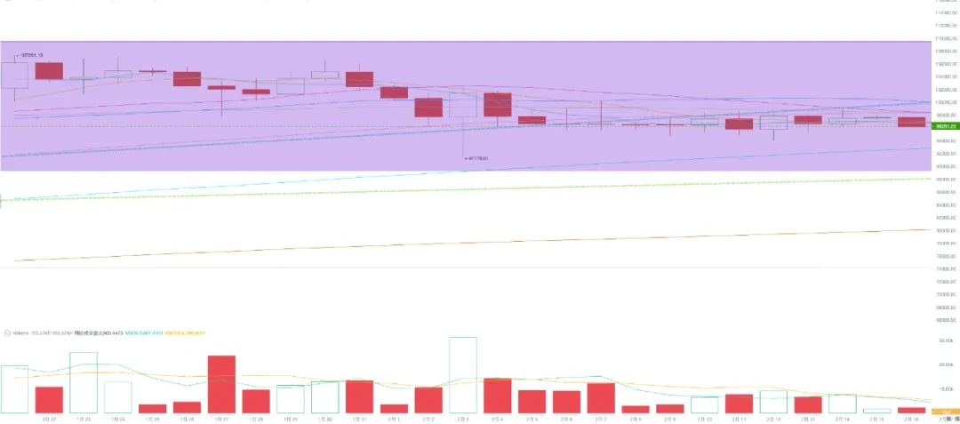 本周 BTC 开于 96481.47 美元,收于 96119.88 美元,全周下跌 0.37% ,振幅收窄至 5% ,成交量大幅萎缩。BTC 价格仍保持在“特朗普底”(89000 ~ 110000 美元箱体)之内。