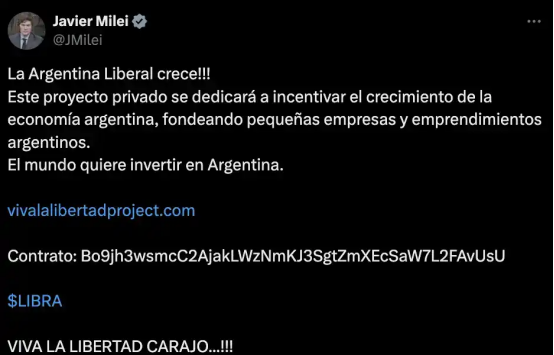 在个人官方X账户,米莱表示将推出一款名为LIBRA的Meme币,并公布了相关合约地址,其还提到发行的LIBRA代币将用于国家融资。在通常的市场反应中,当知名人物发行代币,一般会率先质疑可信度,怀疑是否是黑客操纵。但在米莱侧,可信度却大幅度增加。