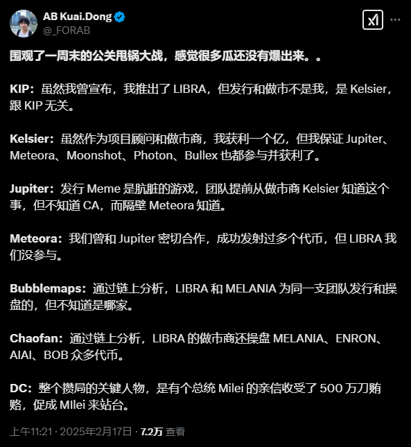 眼见大火烧在了城门口,做市商Kelsier开始甩锅转移矛盾,这一甩,就甩在了总统身上。Kelsier发布公告,表示总统违约,不仅在达成协议后改变立场删除推文,甚至还将退出原因归咎于项目方身上,并提出将采用1亿美元所持资金回购销毁 LIBRA,不会将这笔资金给到总统以及KIP团队。 Hayden Davis更是发布视频表示自己是米莱的顾问,直指Photon、Bullex、Meteora、Jupiter、Moonshot等项目都参与LIBRA的发行并获利颇丰。甚至有知情人士爆料,是总统的亲信收受了500万美元贿赂为项目引荐。