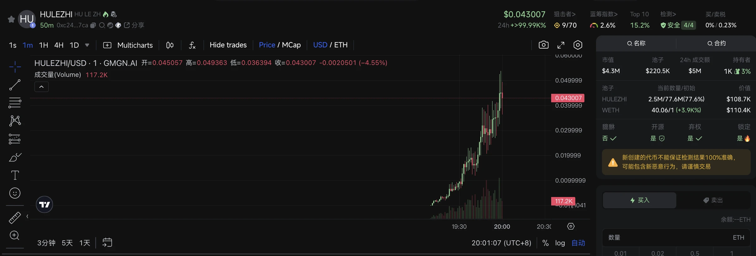 作为 hulezhi 发布链上消息的 ETH 生态 Meme币同样反应不慢,目前大写的同名Meme币 HULEZHI 市值暂报430万美元,价格暂报0.043美元,此前市值曾一度突破500万美元。