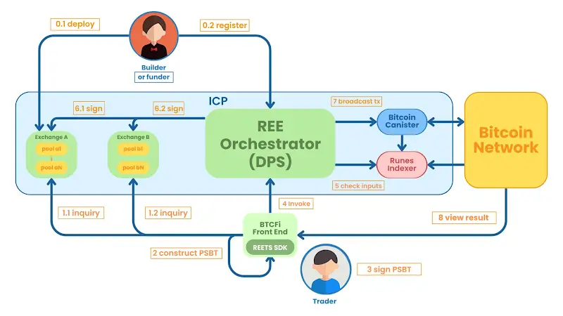 REE (Runes Exchange Environment) 成功将比特币的原生交易机制与公链智能合约完美结合。有了智能合约能力,就可以支持各种 BTCFi 场景,本质上就成为了 Bitcoin 主网的通用 DeFi 执行层,一个可以让各种 BTCFi 协议之间同步、组合的平台。