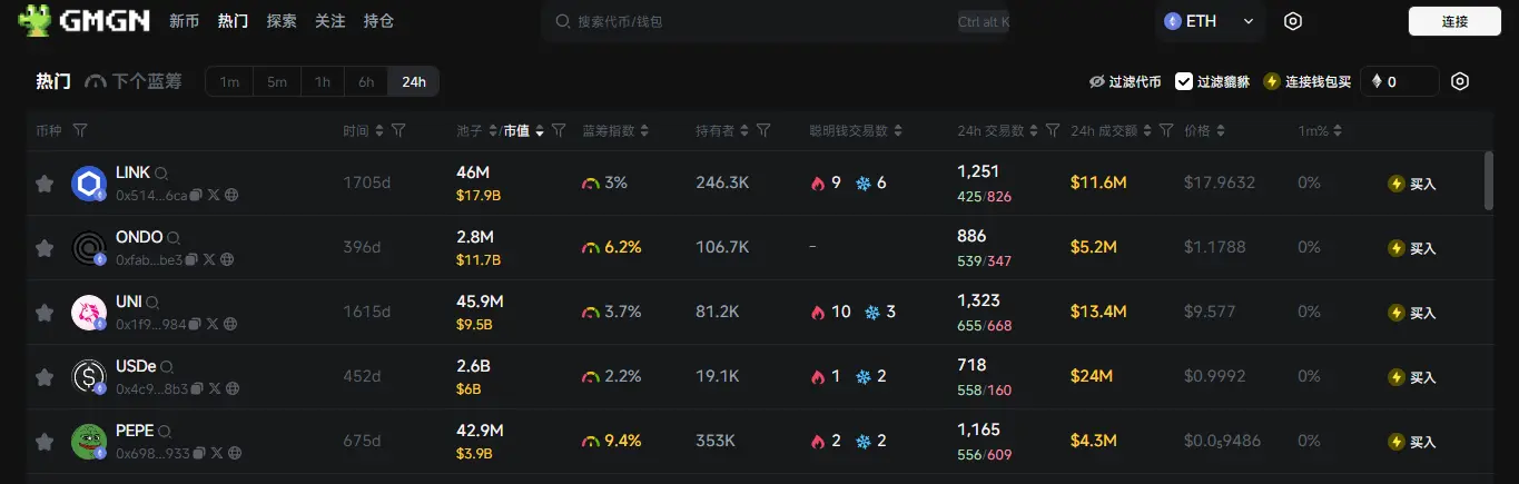 过去 24h 以太坊热门代币前五依次为:LINK、ONDO 、UNI、USDe、PEPE