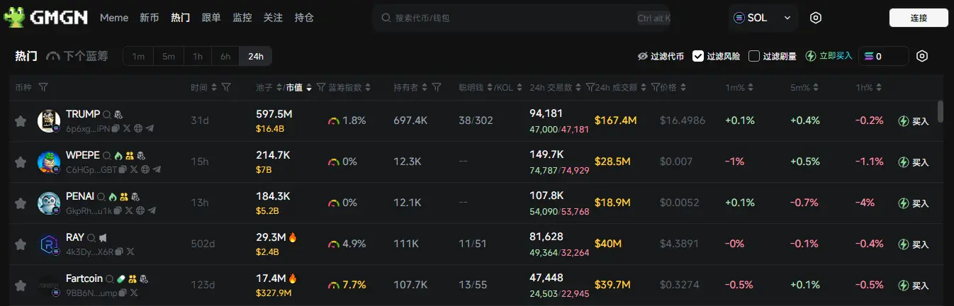 过去 24h Solana 热门代币前五依次为:TRUMP 、WPEPE 、PENAI、RAY 、Fartcoin