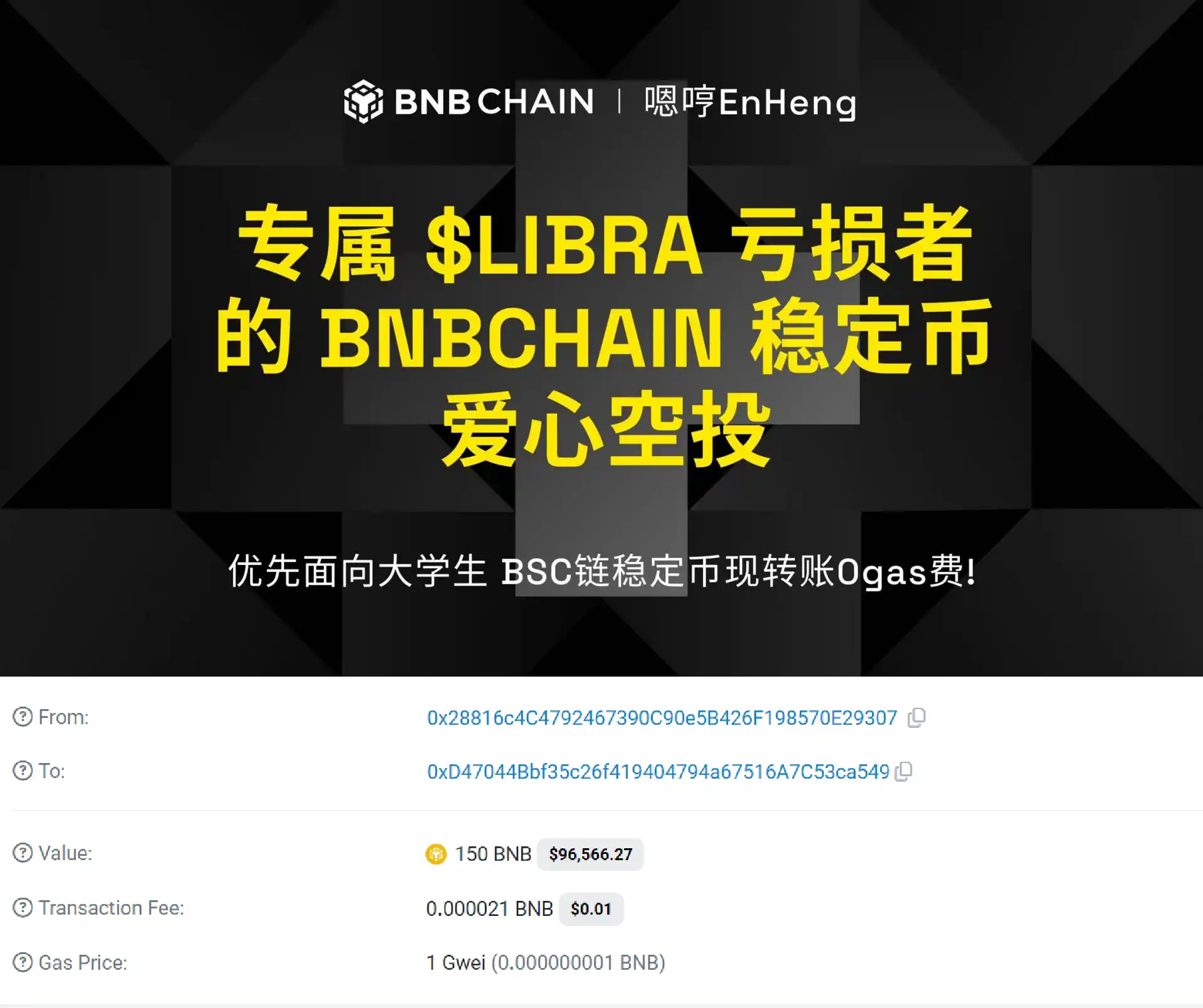 事情的起因还要追溯到阿根廷总统 Milei 发币事件,大量币圈投资者遭受了大额亏损,于是一名在读大学生 KOL 自发发起了 BNB Chain 上的 5 万美元慈善晚餐援助计划,面向所有受害者进行补偿(大学生优先)。随后 CZ 对这一项目表达了支持,向该 KOL 公开的慈善地址转账 150 个 BNB(约 10 万美元),合作发起了「专属 $LIBRA 亏损者的 BNBCHAIN 稳定币爱心空投」。然而,这一善举意外成为巨鲸操盘的「导火索」——CZ 公布的捐款地址被投机者视为「官方背书信号」,引发新一轮 Meme 币炒作。