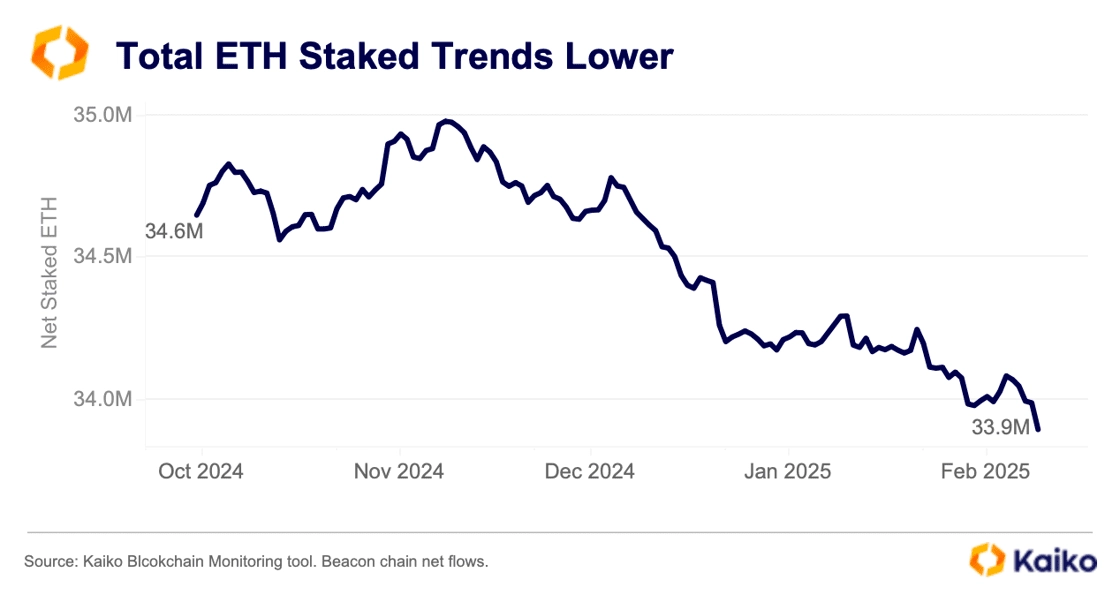 通过 Kaiko 的区块链监控工具可以发现,以太坊信标链上的净流量在 2024 年第四季度出现下降。作为仅次于 Lido 的第二大 ETH 质押实体,Coinbase 是这一下降趋势的主要贡献者之一。数据显示,在过去六个月中,Coinbase 在质押市场的份额下降了 3.8%,同期净 流出 129 万枚 ETH。