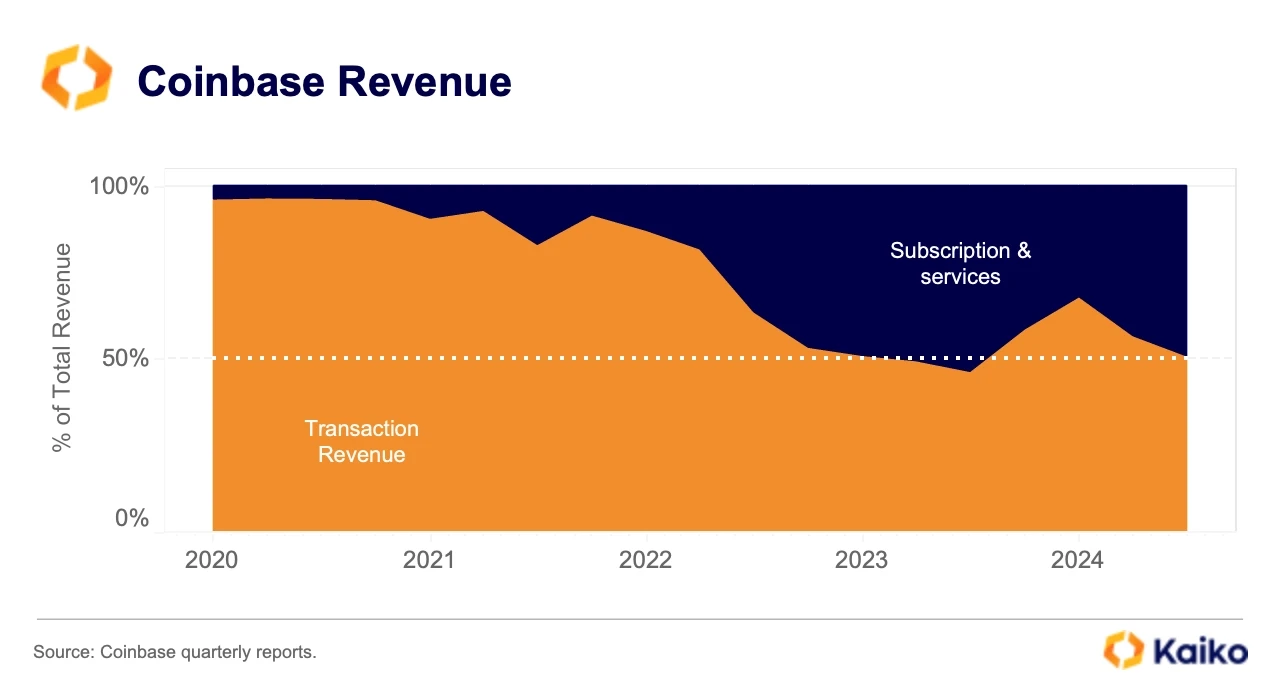 近年来,Coinbase 的收入来源逐渐多元化,其“订阅和服务”业务(包括质押奖励、托管费用和 USDC 利息)在总收入中的占比明显上升。