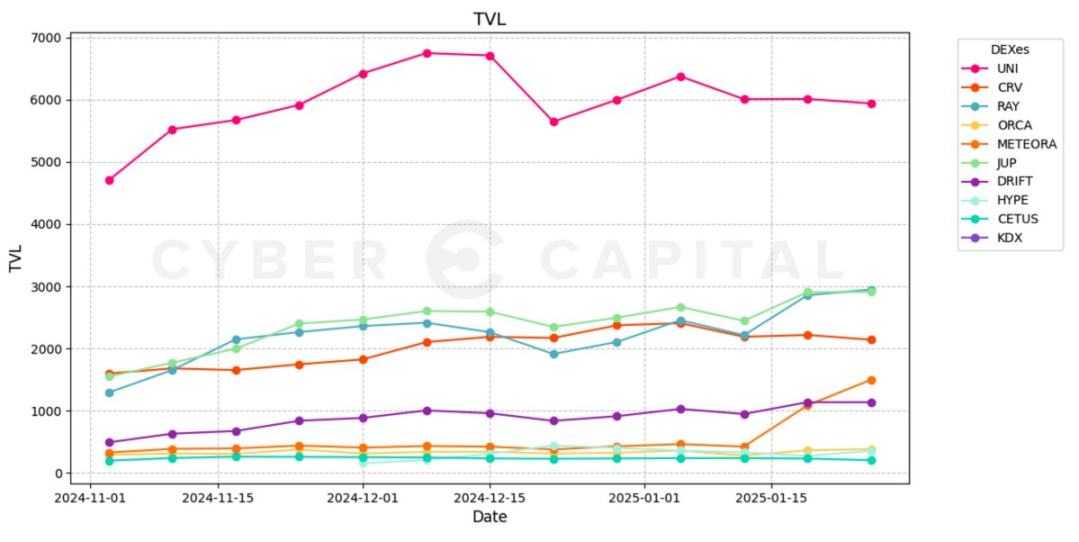 总锁仓价值增长趋势:Raydium、Jupiter 和 Meteora 的持续主导地位表明长期流动性的可持续性。在高压力市场条件下,新兴协议的粘性表现值得关注,不容忽视。