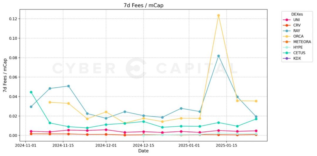 费用与市值比率:Orca 在需求旺盛的月份表现出极高的效率,但其流动性留存不足阻碍了长期竞争力。另一方面,JUP 则面临相反的情况,受到其商业模式的限制。与最新的 「热门项目」 Hyperliquid 相比,Raydium 以八分之一的完全稀释估值产生了十倍的费用。