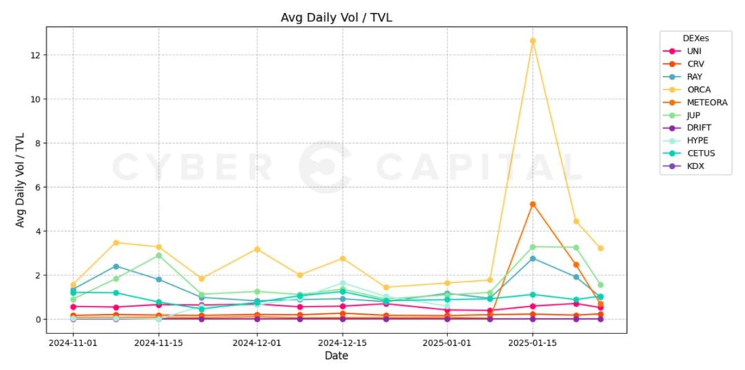 总锁仓价值(TVL)留存:Meteora 借助 Pengu 空投以及特朗普和梅拉尼娅相关 Memecoin 推出等重大事件取得发展。虽然在 Memecoin 推出期间,许多交易对的交易量 / 总锁仓价值(Vol/TVL)比率因临时需求而上升,但 Meteora 的总锁仓价值在事件之后持续上升,显示出良好的留存率。