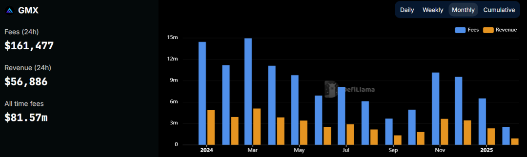 作为早期的链上衍生品交易所之一,与当前主流的订单薄模型不同,GMX 使用自动做市商模型(AMM)进行永续合约交易。用户提供资产(如 ETH、BTC、稳定币)到 GMX 的 GLP 池,作为 GMX Traders 的交易对手方。不过,相比于订单薄模型,AMM Perp 不太适合跑策略,更适合一些低频交易,因此 GMX 展现出来的特点是持仓量较高但日交易量偏低。尽管受到 Hyperliquid 等订单薄 Perp 挑战,DeFiLlama 数据显示,GMX 在 2024 年仍然捕获了约 1.11 亿美元费用,其中有 5 个月捕获费用超过了 1,000 万美元。