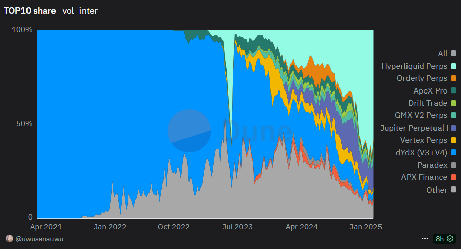 Hyperliquid 是一个链上Perpetual Contract Exchange,并推出了荷兰拍拍卖机制来获得发行新现货席位的机制。Hyperliquid 的收入主要来源于合约交易费用、 HIP-1 拍卖费、现货交易费用和 HLP MM PnL。目前 Hyperliquid 已成为第一大链上衍生品交易所,其交易量占据市场份额的约 60%。