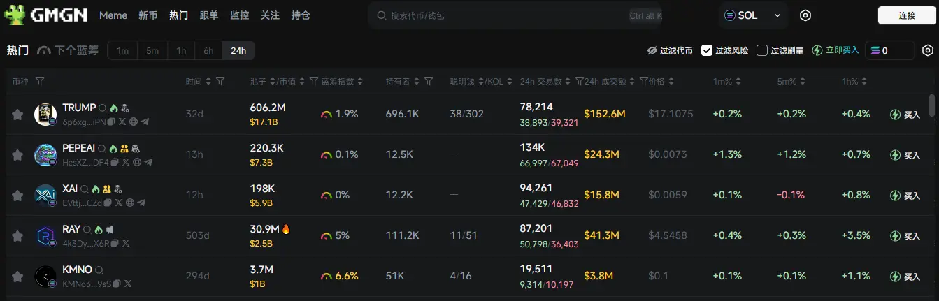 过去 24h Solana 热门代币前五依次为:TRUMP 、PEPEAI 、XAI、RAY 、KMNO