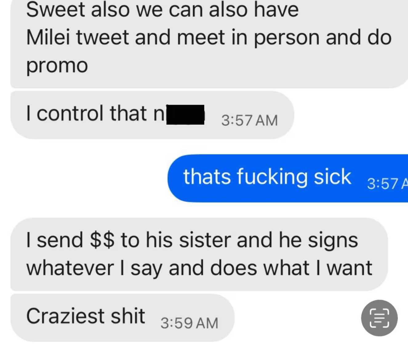 2月19日,Coindesk报道称,Hayden Davis曾在去年12月的短信中表示,他可以“控制”阿根廷总统米莱,因为他一直给米莱的妹妹Karina Milei(现阿根廷总统府秘书长)打钱。“我给他妹妹汇钱,他就会签署我说的任何内容,并按照我的意愿行事。”该信息披露是发酵数日的LIBRA代币丑闻事件的最新进展。