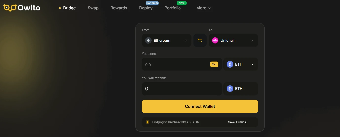 STEP 1. 跨链:通过跨链桥(链接: https://owlto.finance/ ),将少量 ETH 或其他资产(如 USDT、USDC)从以太坊主网或其他以太坊二层网络跨至 Unichain 网络,或从 Unichain 网络跨回至其他网络。
