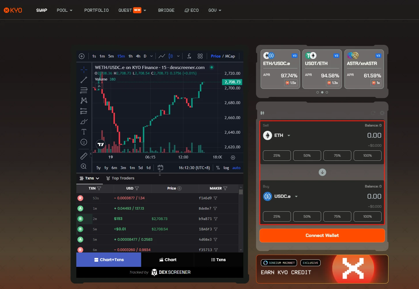 STEP 4. 进入交互网站(链接: https://app.kyo.finance/swap )后连接钱包,将 ETH(价值超过 5 美元)兑换为 USDC.e。