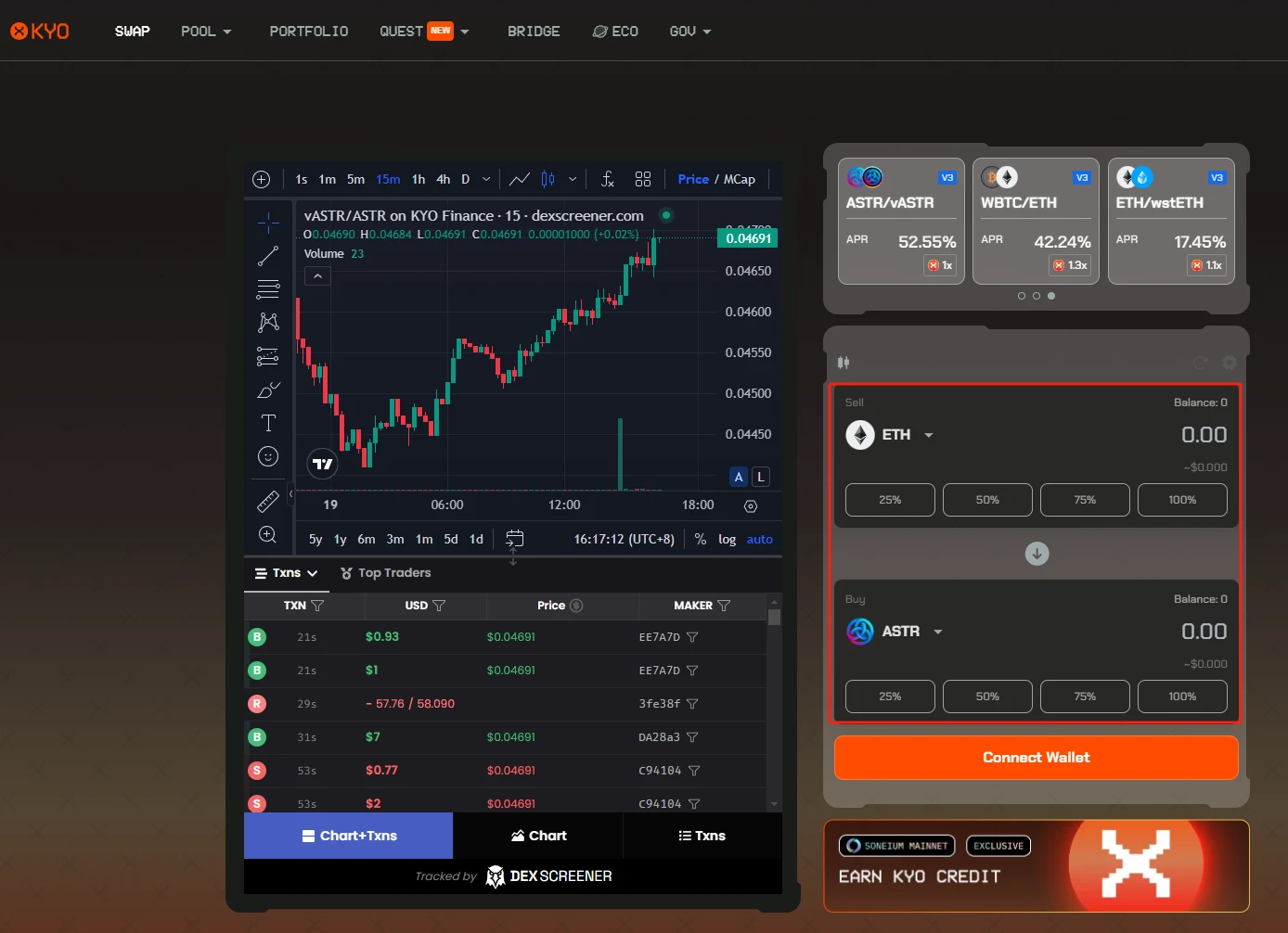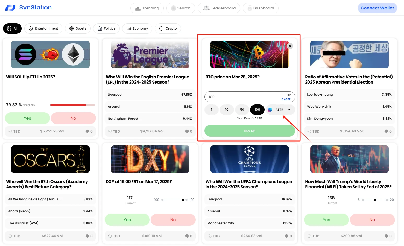 STEP 6. 进入交互网站(链接: https://app.kyo.finance/swap )后连接钱包,将 ETH 兑换成 ASTR,然后进入预测平台(链接: https://market.synstation.org/ ),随机选择一个进行下注,选择 ASTR 进行下注。