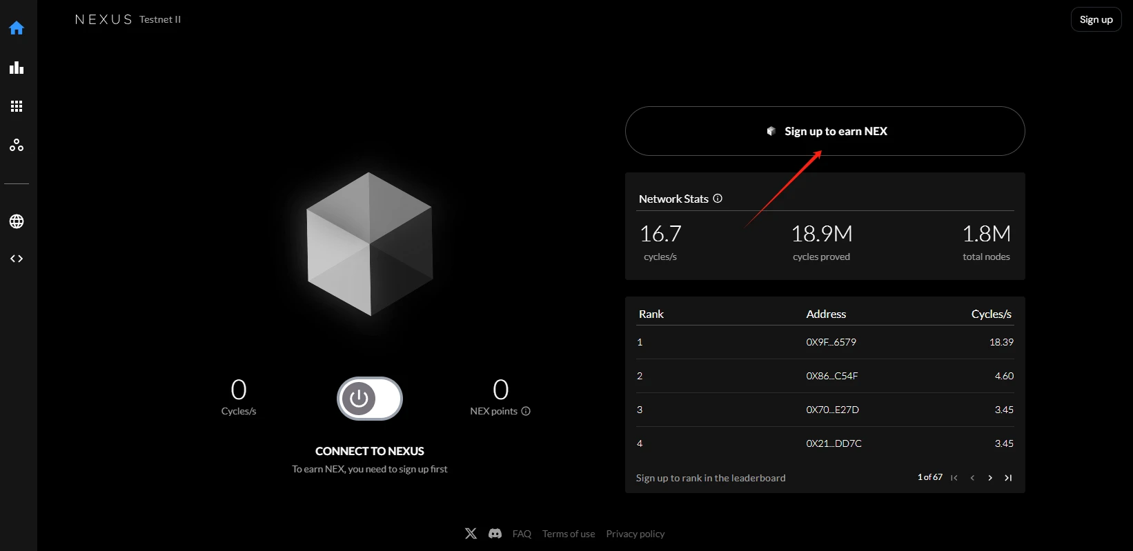 STEP 1. 进入交互网站(链接: https://app.nexus.xyz/ )后,点击“Sign up to earn NEX”,通过谷歌邮箱进行登录。