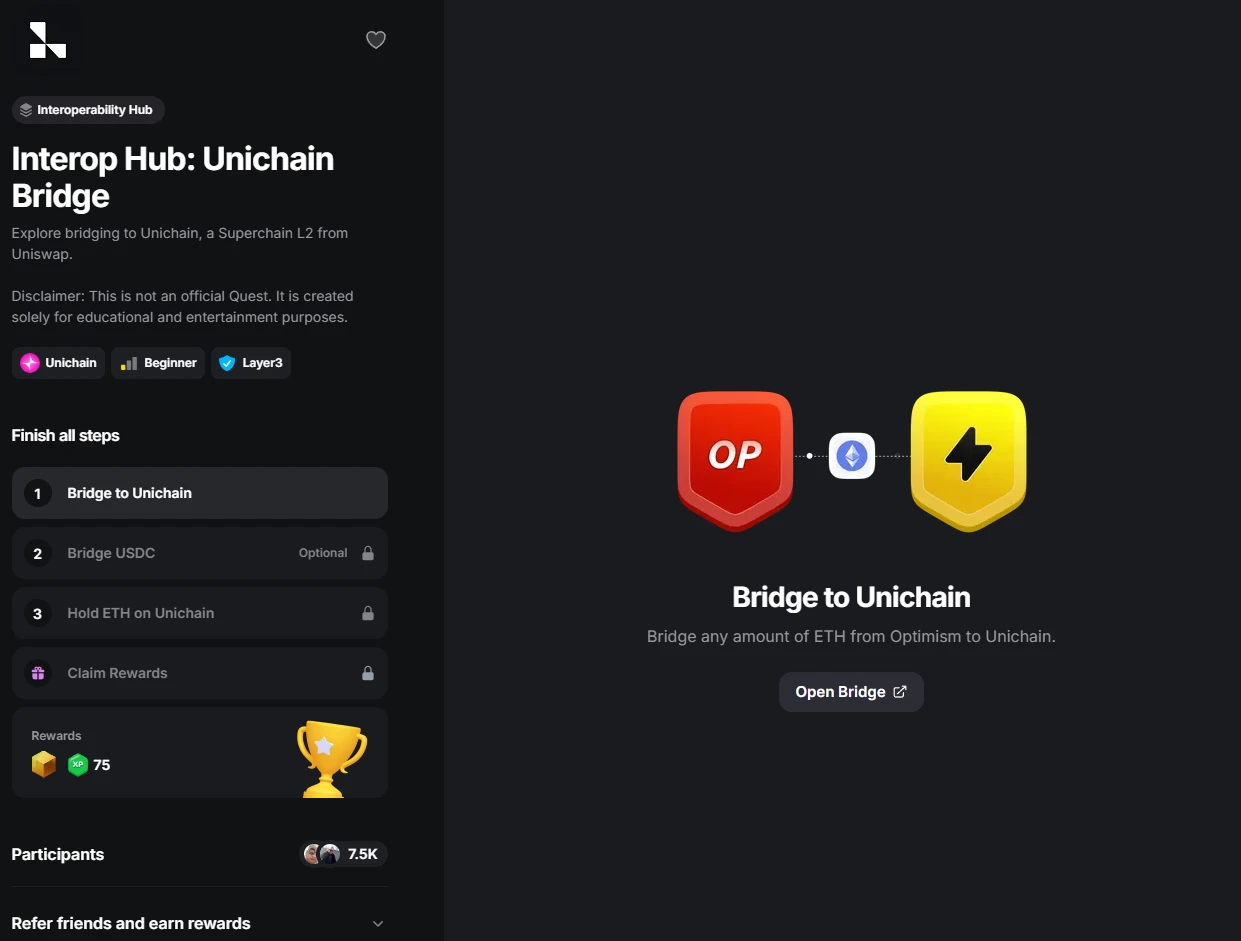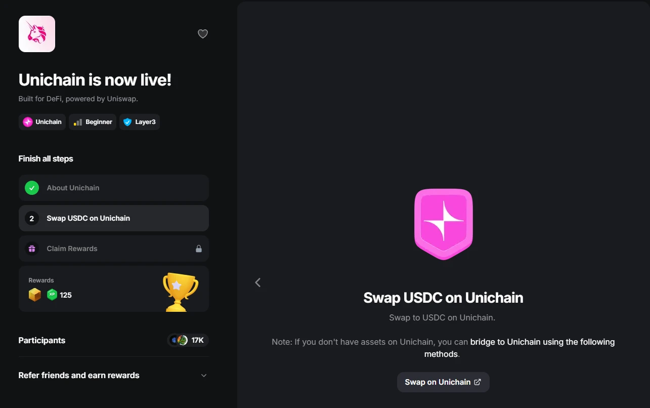 STEP 2. 完成两个 Layer 3 任务 Unichain is now live、Interop Hub: Unichain Bridge,链接分别为: https://app.layer3.xyz/quests/unichain-is-now-live 、 https://app.layer3.xyz/quests/interop-hub-unichain-bridge ,任务为基本的跨链、Swap 等交互操作。