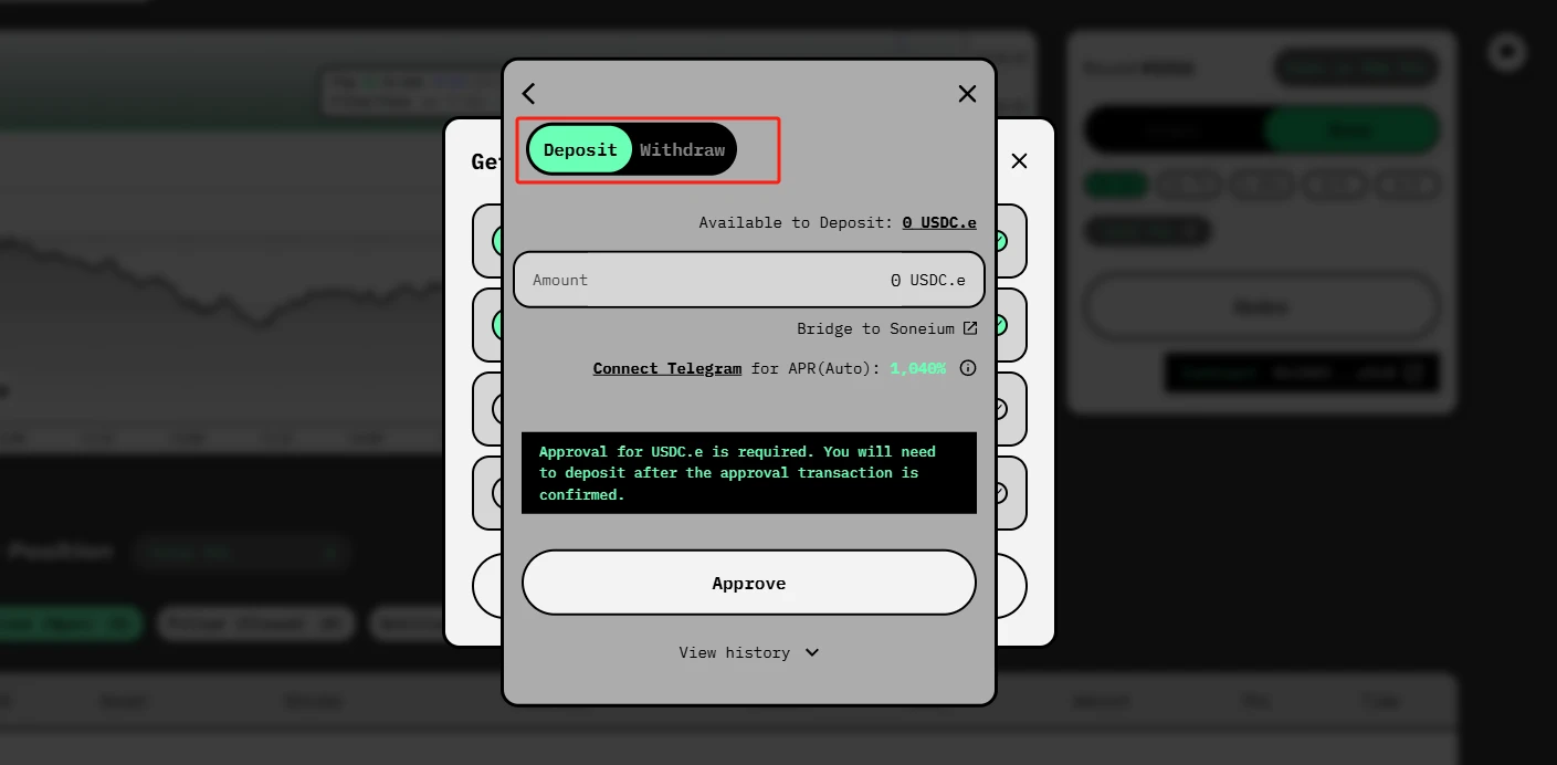 STEP 5. 进入交互网站(链接: https://supervol.io/trade )后连接钱包,击右上角的 Deposit,存入 USDC.e。
