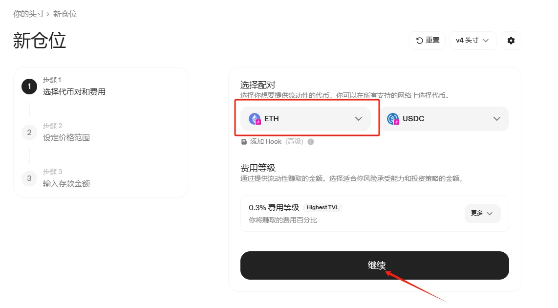 STEP 3. 添加流动性(链接: https://app.uniswap.org/positions/create ):选择 Unichain 的 ETH 后再选择一种资产后点击“继续”,默认“全区间”,最后输入存入代币数量即可。