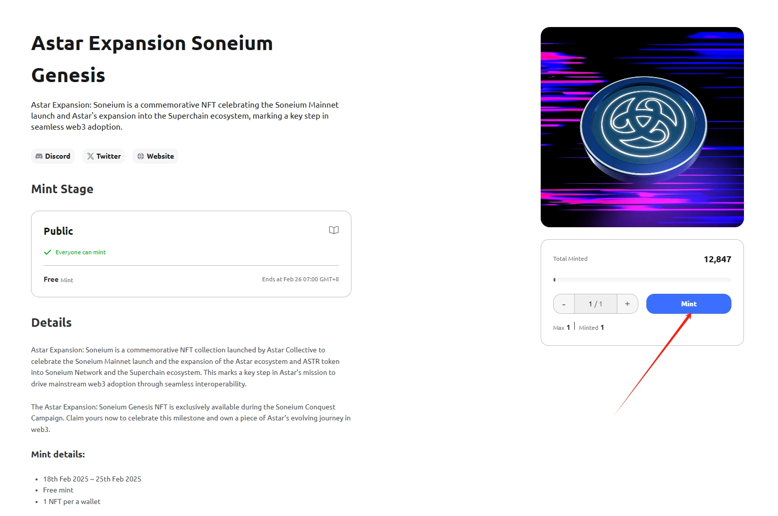 STEP 1. 铸造 Astar NFT(链接: https://launch.sonova.one/launchpad/Astar_Expansion_Soneium_Genesis )。