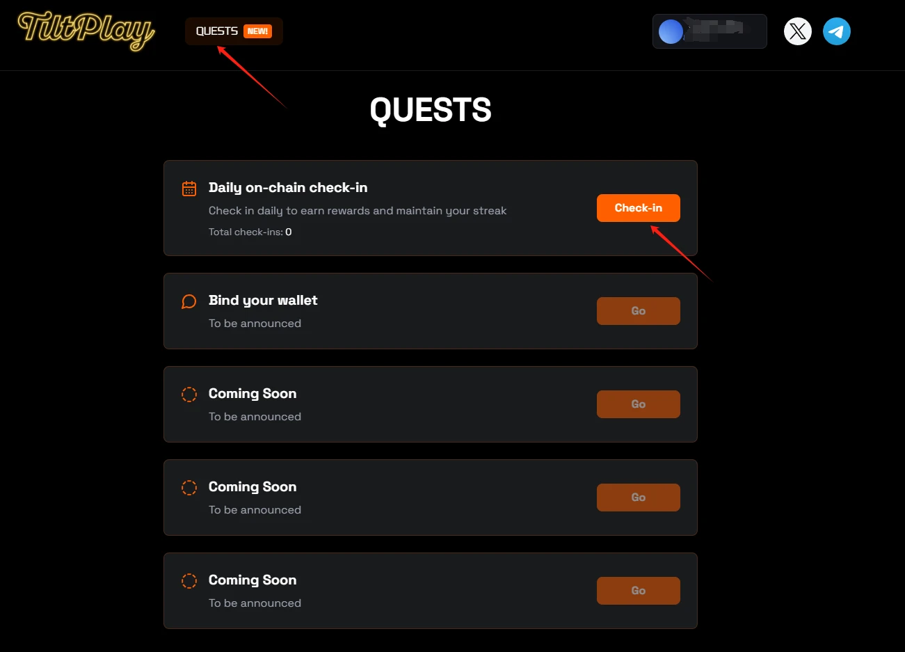 STEP 7. 进入交互网站(链接: https://www.tiltplay.gg/ )后连接钱包,点击“QUESTS”,选择第一个签到任务后点击“Check-in”即可。