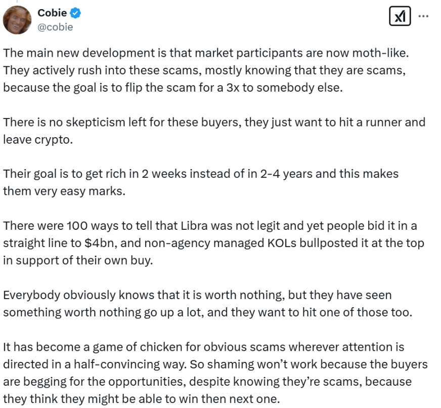 目前备受争议的高估值 VC 币以及模因币里的快节奏问题,Cobie 也对此做了一针见血的评论,他表示目前市场的发展脉络是市场参与者像飞蛾一样积极冲进这些骗局,大多人也明知这些是骗局,但目标就是为了以 3 倍的价格卖给接盘者。他们只想在 2 周内暴富,而不是 2-4 年。玩家希望自己也能在下一次行动中得大奖。