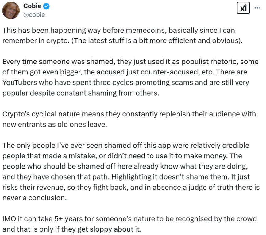 「这种情况早在模因币出现之前就已经存在了,基本上自我接触加密行业以来就是如此。(最近的这些操作只是更高效、更明显而已。)每次有人被羞辱,他们都会把这当作民粹主义话术来利用,有些人甚至因此变得更受欢迎。被指控的人只会反过来指控别人,形成对立。比如,一些 YouTuber 已经连着三个周期推广骗局了,尽管不断有人揭露他们,但他们依然很受欢迎。加密行业的周期性意味着,总会有新进入者填补老用户的流失,因此这些人总能找到新的受众。