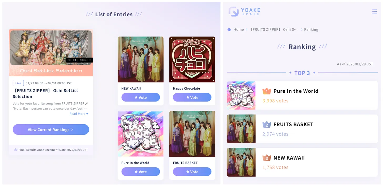 Yoake利用区块链解决粉丝社区的常见痛点:投票操控与版税分配不透明。平台将所有投票记录于Soneium链上,形成可验证的透明系统。粉丝可通过社交媒体账号投票(无需加密钱包),区块链记录由平台自动完成。此系统支持从偶像团体演出曲目选择到时尚竞赛投票等多种活动。