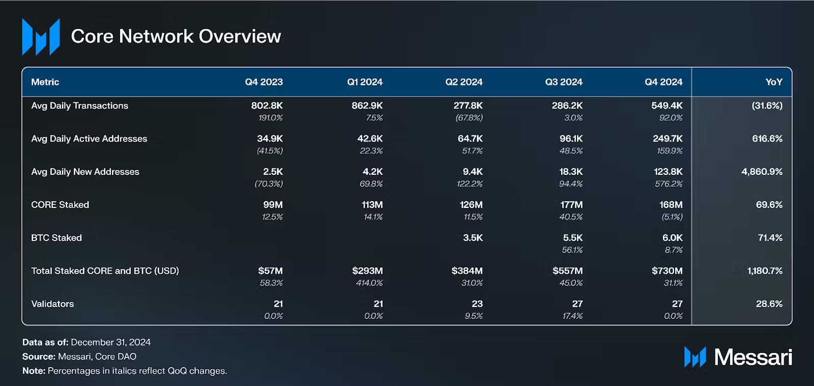 Core在第四季度发布了Fusion升级,推出了双重质押并引入了LstBTC。在第四季度,共有1,298个比特币和1650万个CORE进行双重质押,分别占Core网络上所有比特币和所有CORE质押的22%和19%。