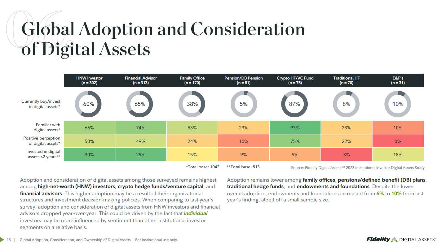 如果深入分析这些数据,可以发现两种类型的投资者。 一方面是由个人驱动的机构投资者,比如高净值个人、投资顾问公司、加密对冲基金/VC等,70至80%已经投资了数字资产。另一方面是大机构,比如养老基金、传统对冲基金、捐赠基金、基金会,遗憾的是,这个比例仍然处于个位数的百分比。当前比特币市值约2万亿美元,机构投资者对比特币的采纳正处于关键转折点,存在大量未被开发的需求。