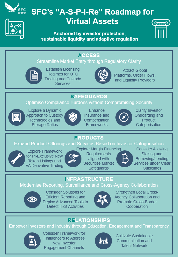 2025年2月19日,香港证监会(SFC)针对虚拟资产市场发布了最新监管路线图“A-S-P-I-Re”,旨在进一步完善虚拟资产市场监管,引入更多类型的虚拟资产产品与功能,平衡香港Web3行业的创新与风险管理。